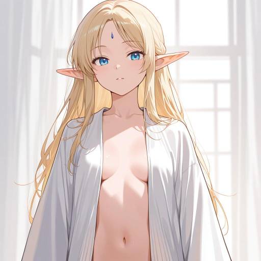 A figure dressed in a flowy white chiffon toga, accentuated by bold tribal patterns and arm jewelry, standing in a sandy desert at dawn with wispy clouds in the sky.