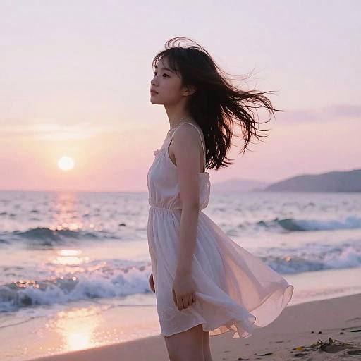 Mermaid Hair hairstyle on young woman, wearing flowing bohemian dress, in coastal cliff, captured in fashion editorial style with glowing hue.
