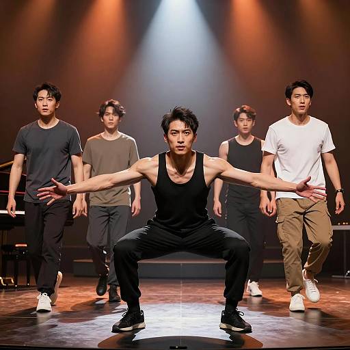 Low angle shot from the side, 3 Asian men wearing casual tank tops and shorts, flexing their biceps, toned muscles, sun-kissed skin, strong jawlines, focus on their arms, playful energy.