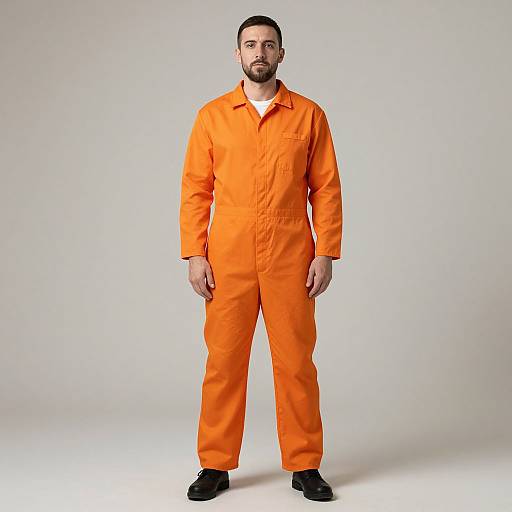orange inmate pants costume, photograph of a man in an orange prison uniform standing in a narrow, dimly lit prison hallway, white short-sleeve shirt with orange collar, orange pants, hands in pockets, serious expression, short dark hair, medium build, light skin, background has gray walls with orange stripe, dark door in the background, realistic, mid shot, frontal view, slight shadow on the floor, prison setting, realistic lighting