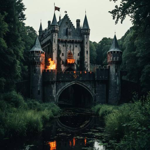Vast castle with turrets and a drawbridge perched on a high mountain above a dark forest at midnight. Captured in cinematic lighting with an ultra-realistic 4K finish.