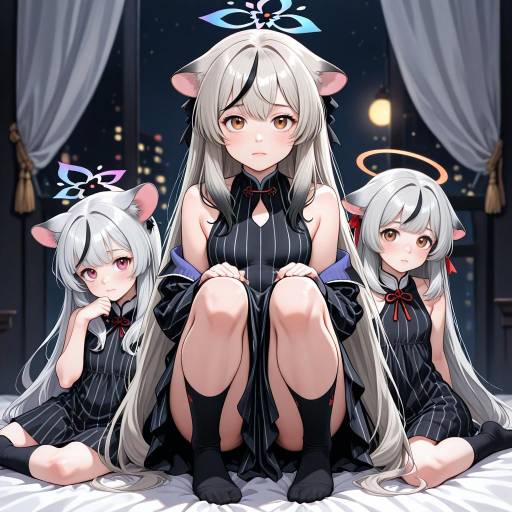stocking_psg,1girl,multicolored hair,thighhighs,colored inner hair,halo,toeless legwear,pink hair,long hair,bow,twotone hair,striped clothes,blue hair,open mouth,hair bow,grey background