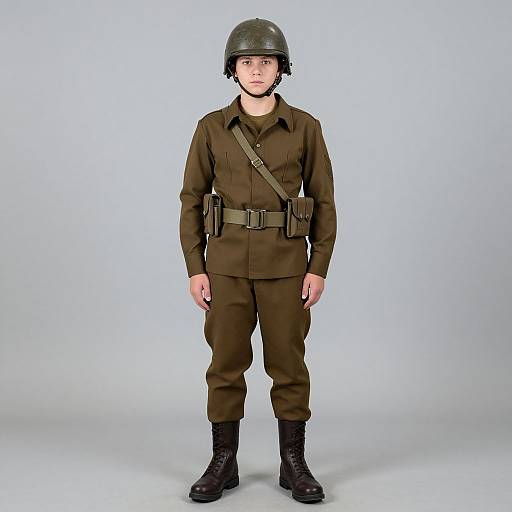 soldier costume, 1boy, male focus, solo, blurry background, realistic, blurry, helmet, jacket, shirt, necktie, collared shirt, upper body, looking at viewer, closed mouth, blue eyes, breast pocket, brown jacket, pocket, uniform, military uniform, world war ii, military, buttons, strap, black hair