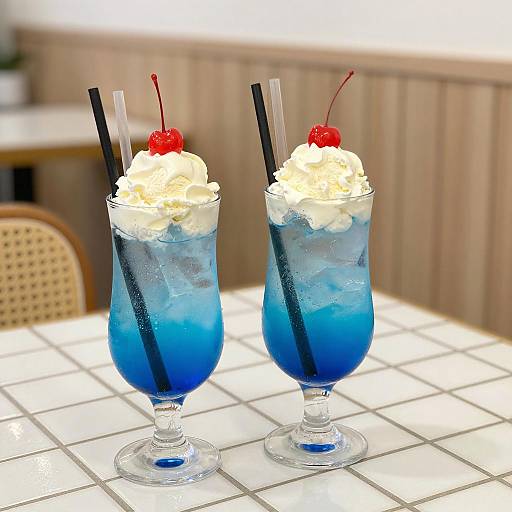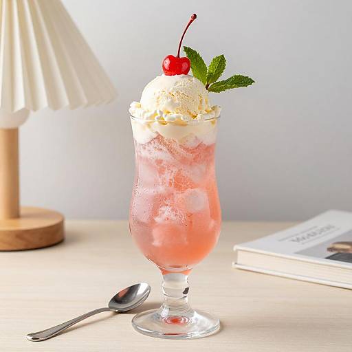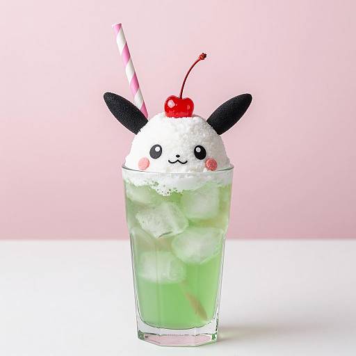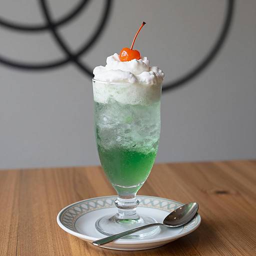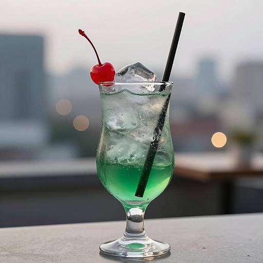 Photograph of a tall, clear glass with a green, icy drink, a large ice ball, and a red cherry on top. Black straw on the right. Background: blurred cityscape with bokeh lights and sky. Drink has visible ice cubes.