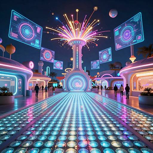 Pixel art illustration of cyberpunk cityscape created in intricate mosaic format with neon-lit alleyway
