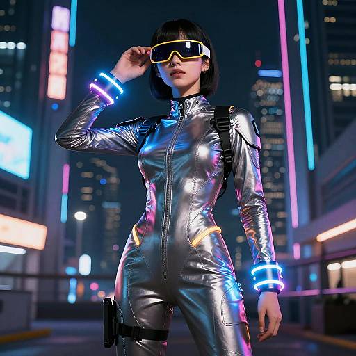 a futuristic cyborg, wearing a sleek metallic bodysuit, with neon face paint, detailed and elegant