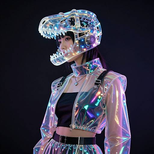 futuristic dancer, tech-inspired asymmetrical cut, fit and agile, LED-embroidered tank top, metallic cropped jacket, holographic leggings, light-up sneakers, cyberpunk, neon city studio background