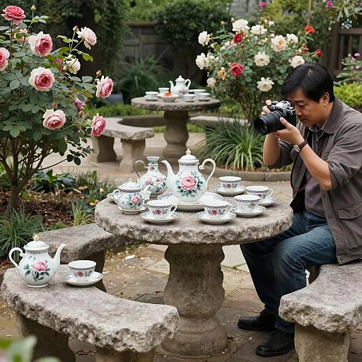 Photograph of six people in an outdoor garden cafe. Five seated at wooden tables, one standing. Men in dark hats, women in straw hats. Casual summer clothing. Large tree with green leaves overhead. Orange ceramic jug on left table. Gravel path and other tables in background. Facial expressions neutral.