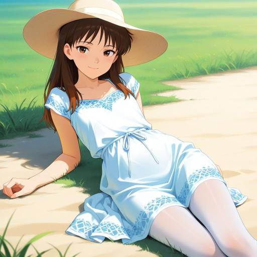 studio_ghibli, 1girl, solo, sitting, long hair, brown hair, smile, subject focus, elegant pose, relaxed atmosphere, natural lighting, cozy setting, modern fashion, patterned maxi dress, bright sunset, standing tall with hands in pockets, tranquil demeanor, anime aesthetic, soothing palette