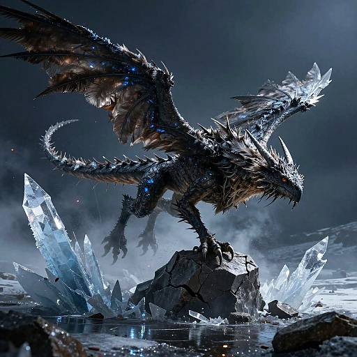 Giant ice dragon perched on a glacier peak, majestic wings spread wide, frosty mist swirling around its chilling presence, sharp ice spikes along its tail, twilight ambiance