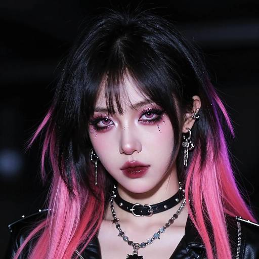 Woman, glam rock, sequin bustier with thin straps, red with geometric patterns, paired with high-waisted vinyl pants, shiny black, accessorized with spiked choker, oversized statement ring.