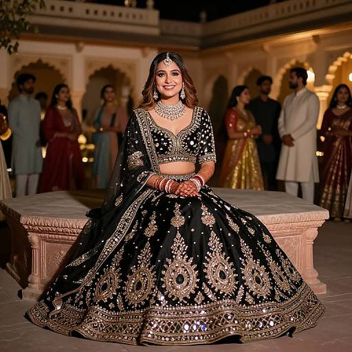 A detailed anime-style illustration of a beautiful bride, long dark brown hair styled in a sleek low bun, wearing a Empire waist gown made of tulle with embroidered sleeves. She is seated gracefully, holding bouquet close to chest, adorned with elegant accessories like gold filigree hair comb, drop pearl earrings, and fingerless lace gloves. The scene focuses on elegance, joy, and a soft romantic atmosphere, with the bride looking at the viewer.