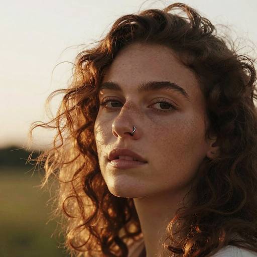 gold fashion ring woman, photorealistic portrait, woman with fair skin, brown wavy hair, gold metallic deep V-neck dress, long sleeves, round belt at waist with gold circular emblem, gold hoop earrings, serious expression, golden ured background with circular pattern, soft lighting, high detail, elegant, glamorous, celebrity-style, fashion photography, realistic ures, warm colors, front-facing, centered composition