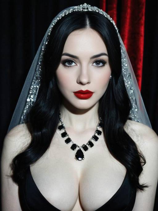 an elegant gothic woman, wearing a flowing black gown, with dramatic eye makeup, detailed and elegant