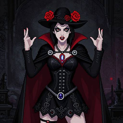 Dark gothic anime portrait of a haunting figure with flowing ink-black locks and pale lips, wearing a dark ceremonial robe with embroidered skull motifs, rendered with intricate detailed line work. The background is filled with numerous small stylized faces in black and white with red accents. High contrast lighting emphasizes dramatic shadows, creating a moody and intense atmosphere with rich red and black tones, subtle textures, and an elegant and mysterious vibe.