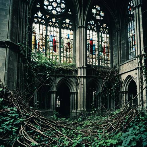 Pen the Gothic cathedral design, in the style of dark romanticism, urban decay, historical documentation, shadow and light fusion, use of vintage imagery.
