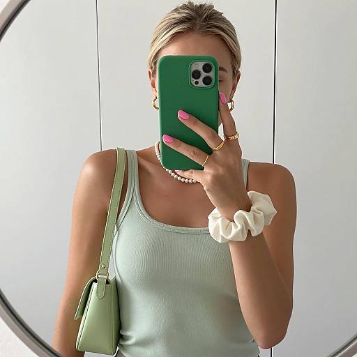 golf outfit, worn by middle-aged woman, featuring breathable sleeveless top and long golf trousers, in deep green and cream, captured in a studio background with high-quality fashion lighting.
