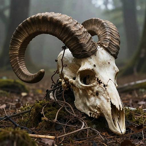 A digital artwork of three skeletal heads with textured, hexagonal-patterned skulls, partially buried in a dark, forested background. The skulls are positioned in the foreground, with two in the front and one slightly behind, all showing hollow eye sockets and teeth. The forest floor is covered in moss and dark shadows, adding a eerie, mysterious vibe to the scene.