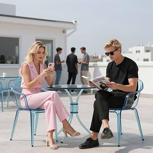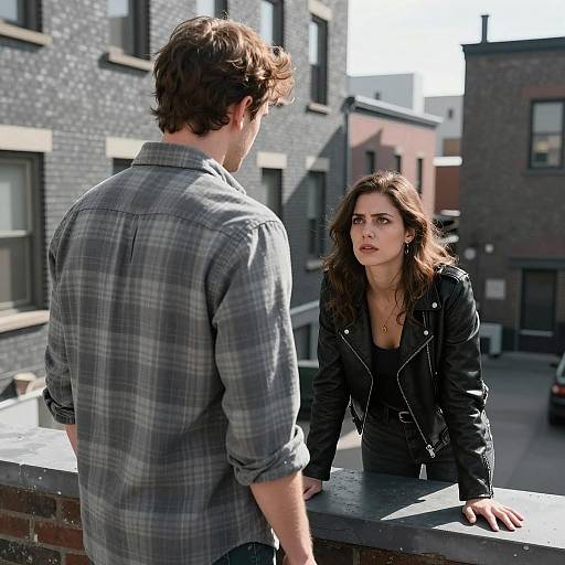 Angled Bob hairstyle on young girl, wearing chic jacket, in rooftop terrace, captured in fashion editorial style with soft morning light.
