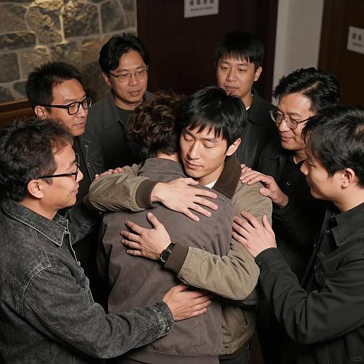 Group of five people in a dimly lit room. Two men in wheelchairs on left and right, one man with beard in brown jacket, woman with light hair and gray cardigan, and one black man in blue shirt. Sunlight casts grid pattern on white wall. Bulletin board with photos and papers in background. People facing each other, engaged in conversation.