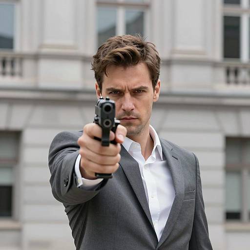 Man in a black suit, white shirt, and black tie, pointing a gun forward. Dark, high-tech background with wires, screens, and red circular lights. Man has short dark hair, determined expression. Left arm extended, right arm raised. Silhouetted, low-light setting.