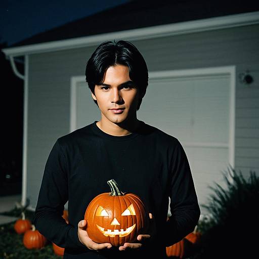 random halloween costume,1girl, solo, jack-o'-lantern, pumpkin, blonde hair, long hair, dress, halloween, tree, flower, lips, realistic, bare shoulders, blurry