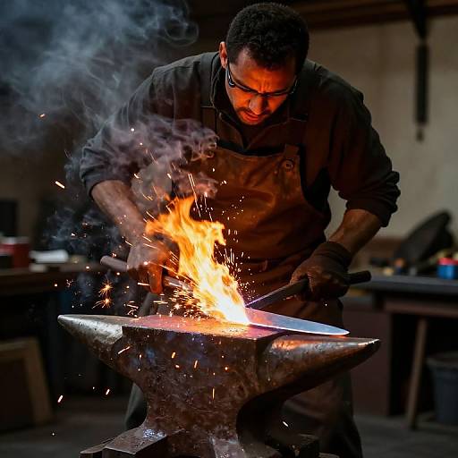 blacksmith forging metal, medieval workshop, close-up shot, 50mm lens, photorealism, award-winning photography, global illumination, ultra-detailed, high quality.