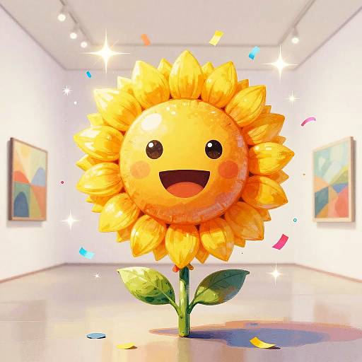 A cartoon-style flower with a happy face, featuring soft, rounded shapes that enhance its cute and friendly appearance. The flower has a joyful expression with simple, expressive features, designed to evoke a sense of warmth and playfulness. The overall style is lighthearted and appealing, with soft edges and a gentle color palette that adds to its charm.