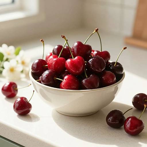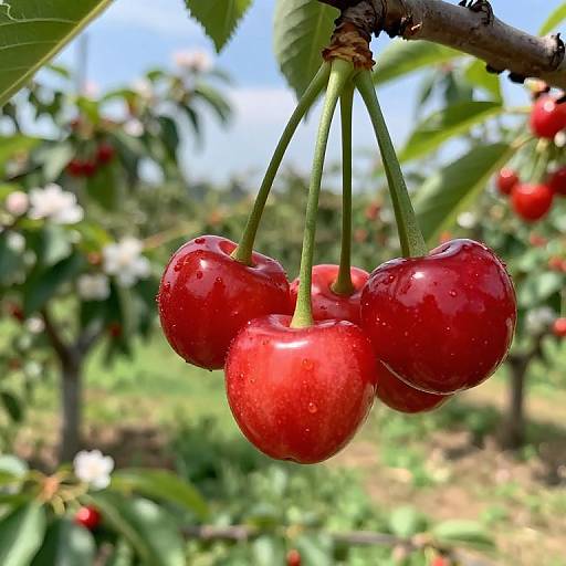 This vibrant image showcases a woman adorned in a stunning cherry-themed dress, elegantly blending fashion with the natural beauty of fruit. The model's striking makeup and lush green leaves accentuate the playful yet sophisticated representation of femininity and nature. This visually captivating piece captures the essence of fusion between fresh produce and high fashion.