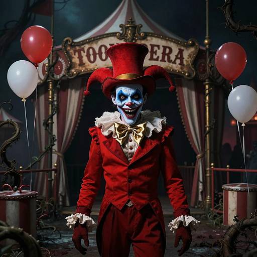 A haunting image of an abandoned amusement park under a blood-red sky, featuring a rusted clown statue with a sinister grin. Volumetric lighting, dystopian atmosphere, intricate pink and red hues, HDR, ultra-detailed