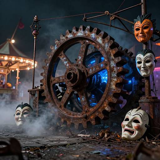 Creepypastas inspired haunted carnival at dusk, abandoned rides shrouded in thick mist, terrifying clowns and monstrous figures lurking behind torn tents, rusted merry-go-rounds spinning slowly, cinematic horror vibe with saturated reds and deep blacks, surreal and unsettling.
