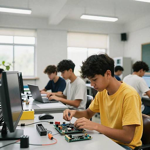 Point-of-view shot of a robot's workshop, a futuristic cityscape with neon lights and flying vehicles, cyberpunk aesthetic, various textures, shapes, and advanced technology, professional composition.