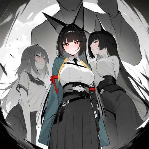 amayadori machi, kumamiko, 1girl, brown eyes, long hair, black hair, brown hair, blunt bangs, twintails, low twintails, small breasts, hakama skirt, miko, miko, red hakama, headband, by artist tajima yuuki, illustrious