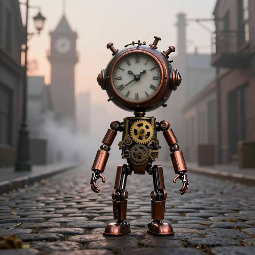 A clockwork automaton intricately designed with copper gears and leather, set against a stunning backdrop that enhances the overall atmosphere of innovation. This artwork invites viewers to explore the future of technology and the relationship between art and robotics.