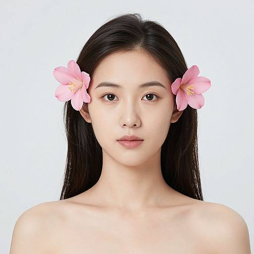 full body, 1girl, solo, pink dress, cheerful girl with sparkling eyes, flowing hair, intricate floral patterns on dress, soft fabric, posing confidently, holding a gift box, pink background