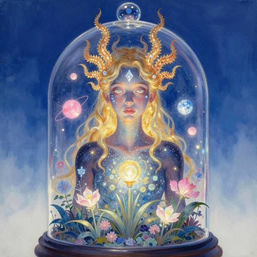 An intimate vignette of a celestial greenhouse where constellation-plants bloom, featuring aurora-inspired gradients of emerald, violet, and silver with starlit glints and showcasing floating glass terrariums tethered by crystalline root bridges glowing like filaments of the Milky Way that blend nature's beauty with an imaginative twist.