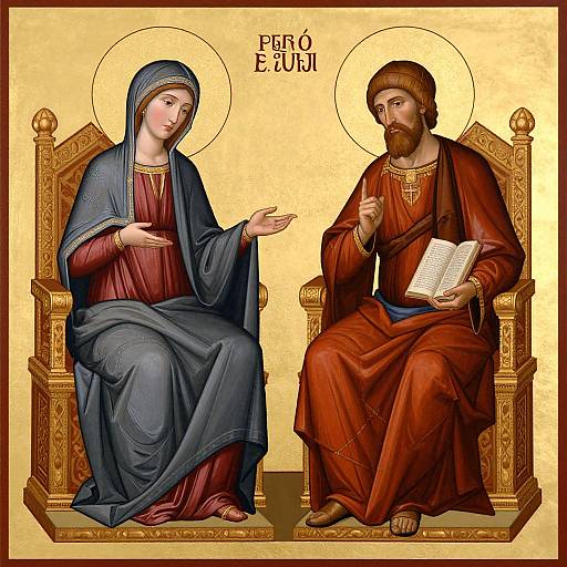 Traditional Orthodox icon depicting the Mother of God of Vladimir, adorned in vibrant blue and red garments, cradling the Christ Child, both encircled by golden halos against a textured background, with ornate details and inscriptions in Latin script.
