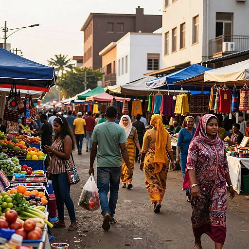 Futuristic farmers working in a bustling market, surrounded by exotic fruits with holographic displays. Inspired by Alphonse Mucha, Andy Warhol, hyper-realistic photography with epic lighting, sharp and intricate details