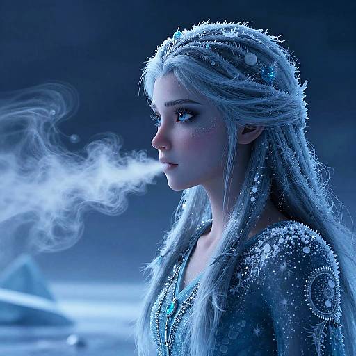 Frozen haircut sculpted from ice, crystal clear frozen strands, futuristic style with light reflections, cold glacier tones, high realism, studio lighting