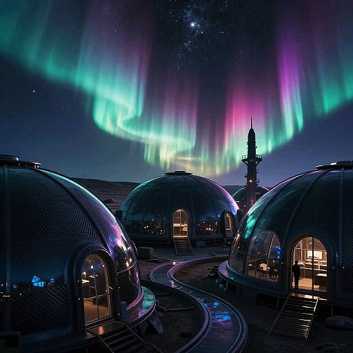 Epic view of icy exoplanet with shimmering auroras from orbit, moody noir atmosphere, cinematic drama, inspired by Beeple & Khyzyl Saleem, high-contrast chiaroscuro with stippled lighting, detailed editorial illustration with fine matte texture, bold electric blue & silver, brutalist silhouettes, swirling misty fog, modern art deco accents.