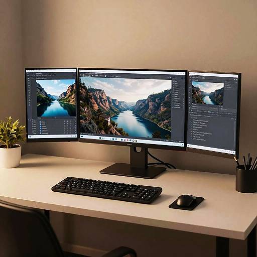A digital design showcasing the advantages of remote work culture. Incorporates calming color schemes, team collaboration tools, and productivity statistics. Wide-angle perspective, warm and creative lighting