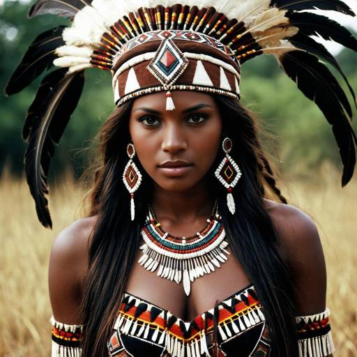 indian tribe outfit,1girl, solo, jewelry, headdress, necklace, long hair, midriff, navel, native american, dark skin, dark-skinned female, looking at viewer, facepaint, feathers, crop top, black hair, tribal, brown eyes
