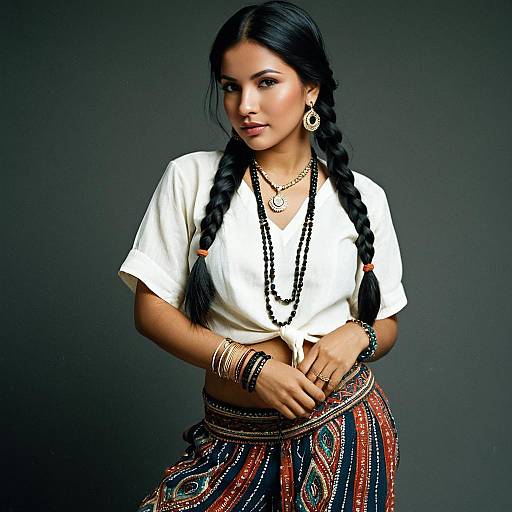 gorgeous Indian woman with dark brown eyes and long, wavy black hair, wearing a vibrant bangle set and adorned with intricate nose jewelry. Dressed in lavish, colorful saris that emphasize her glamorous appearance, she stands against a backdrop of majestic palaces in Jaipur with ornate architecture and lush gardens. The scene exudes an air of elegance and old-world charm, with intricate details that highlight the mix of modern glamour and historic surroundings.