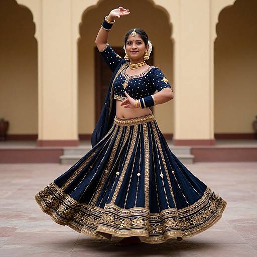 joyful Indian classical Bharatanatyam dancer captured mid-spin, wearing rich jewel-toned silk sari with traditional jewelry, swirling fabric and intense expression, ornate temple courtyard with carved stone pillars; warm festival ambiance, textured cobblestones, festive banners, confetti drifting, volumetric sunlight, subtle motion blur, high detail, soft bokeh, dramatic shadows, rich surface textures, storytelling composition, lively yet elegant atmosphere