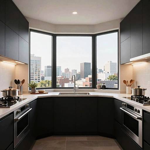 Photograph of an empty, industrial-style room with a large, arched window at the center, featuring a grid of diamond-shaped panes. Two smaller rectangular windows flank the central window. Fluorescent lights hang from the ceiling, casting a blue hue over the room. A wooden shelf stands to the right, and a radiator is below the central window.