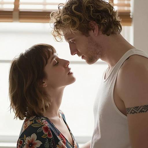 upper body, couple, assertive girl with pixie-cut lavender hair dipped in pastel pearl tones, small round glasses, and shiny emerald eyes, bearded athletic soldier raider divided burgundy bandana surfacing head-shaped intermittent crossing red male brown flawless gross ancestral heresy, smiling, open mouth, fang, hand on another's chest, medium breasts, cleavage, bare shoulders, brown shirt, camisole, blue shirt, collared shirt, brown pants, looking at each other, green background