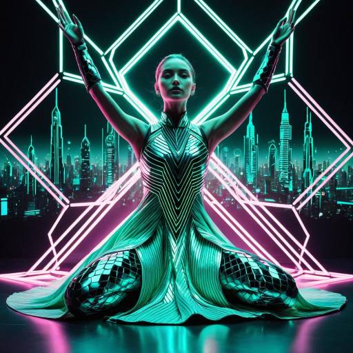 A realistic, glamorous portrait of a woman wearing iridescent hologram pleated skirt and crop top set. The style is inspired by Alex Da Corte, featuring vibrant colors, surreal elements, playful compositions, pop culture references, mixed media aesthetics, whimsical tone, bold textures, and a dreamlike atmosphere. The artwork embraces contemporary art influences with dynamic shapes and an unconventional, expressive approach.