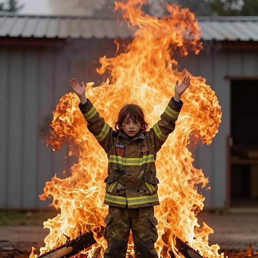Fire painting of fire dancer surrounded by flames in a twilight desert dunes, with vivid fire textures and intense atmospheric lighting.