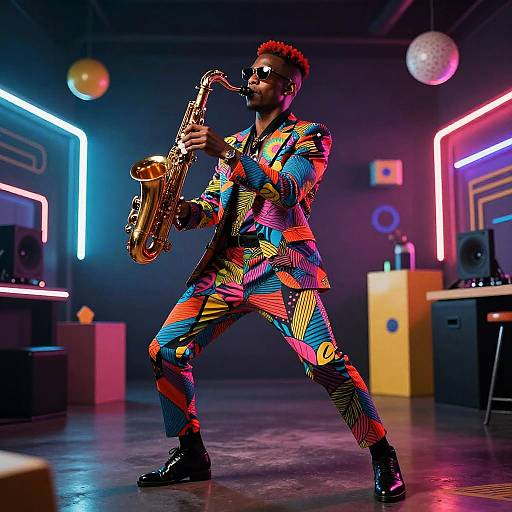 70s outfits: jazzy sax player with pinstripe suit rocking a shiny satin shirt unbuttoned to reveal a gold chain, tight white flared pants, and platform boots, dancing under the lights of a cozy 70s urban jazz lounge with exposed brick walls.