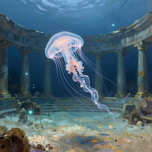 Art of an elegant jellyfish with glowing tentacles, decorated with blue accents, in magewave style with a poolcore vibe. Translucent, soft shading, high-key palette, dark white and gold tones, set in a marine-inspired scene